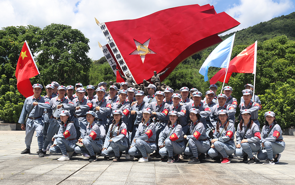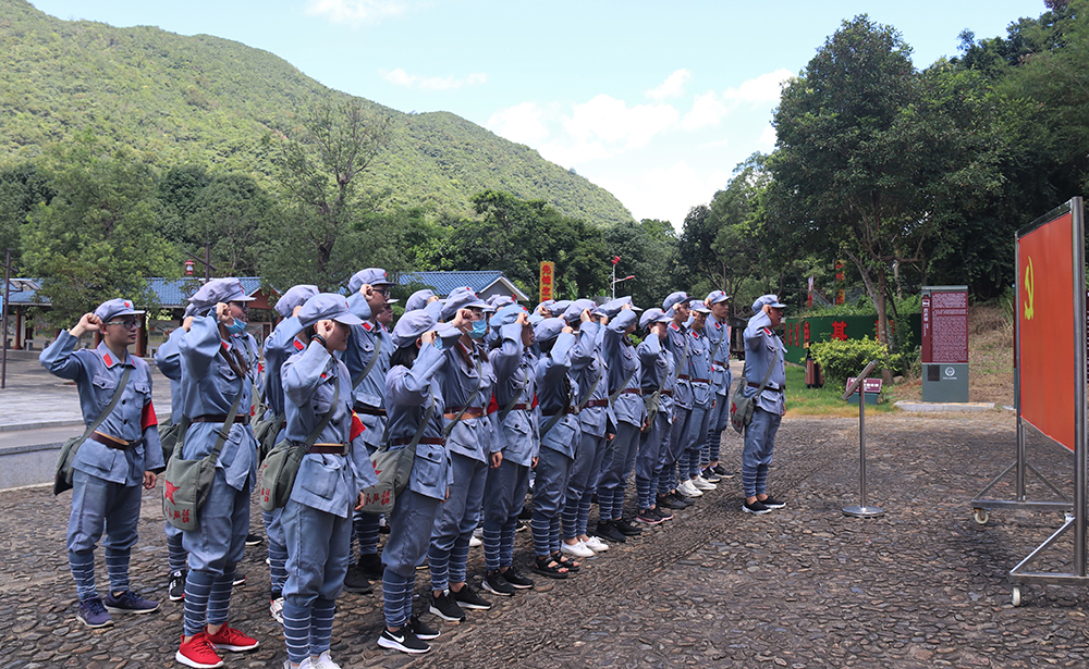 經(jīng)過3個小時的車程,黨員們到達(dá)了有著“東江紅都”之稱的高潭鎮(zhèn)。炙熱的陽光助漲了大家的熱情,換上統(tǒng)一紅軍裝后,在組織委員張斌的帶領(lǐng)下,大家隊列整齊,唱著激昂的歌曲,喊著響亮的口號,踏著堅定的步伐走過馬克思街和列寧街,馬克思街和列寧街是中國最早以共產(chǎn)主義領(lǐng)導(dǎo)人名命名的街道,是極具歷史意義“紅色印記”。緊接著,大家來到烈士紀(jì)念碑前,在莊嚴(yán)肅靜的氛圍中,聽從教官統(tǒng)一指揮,向烈士敬獻(xiàn)花籃、默哀悼念、撫今追昔、緬懷先烈。